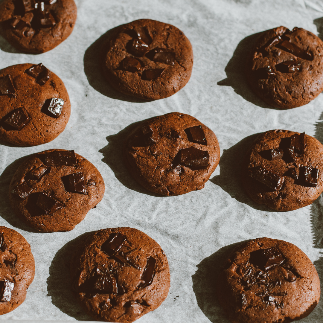 Brown sugar, White sugar, Butter, Vanilla essence, Eggs, Maida, Baking soda, Salt, Chocolate chips, Cocoa powder