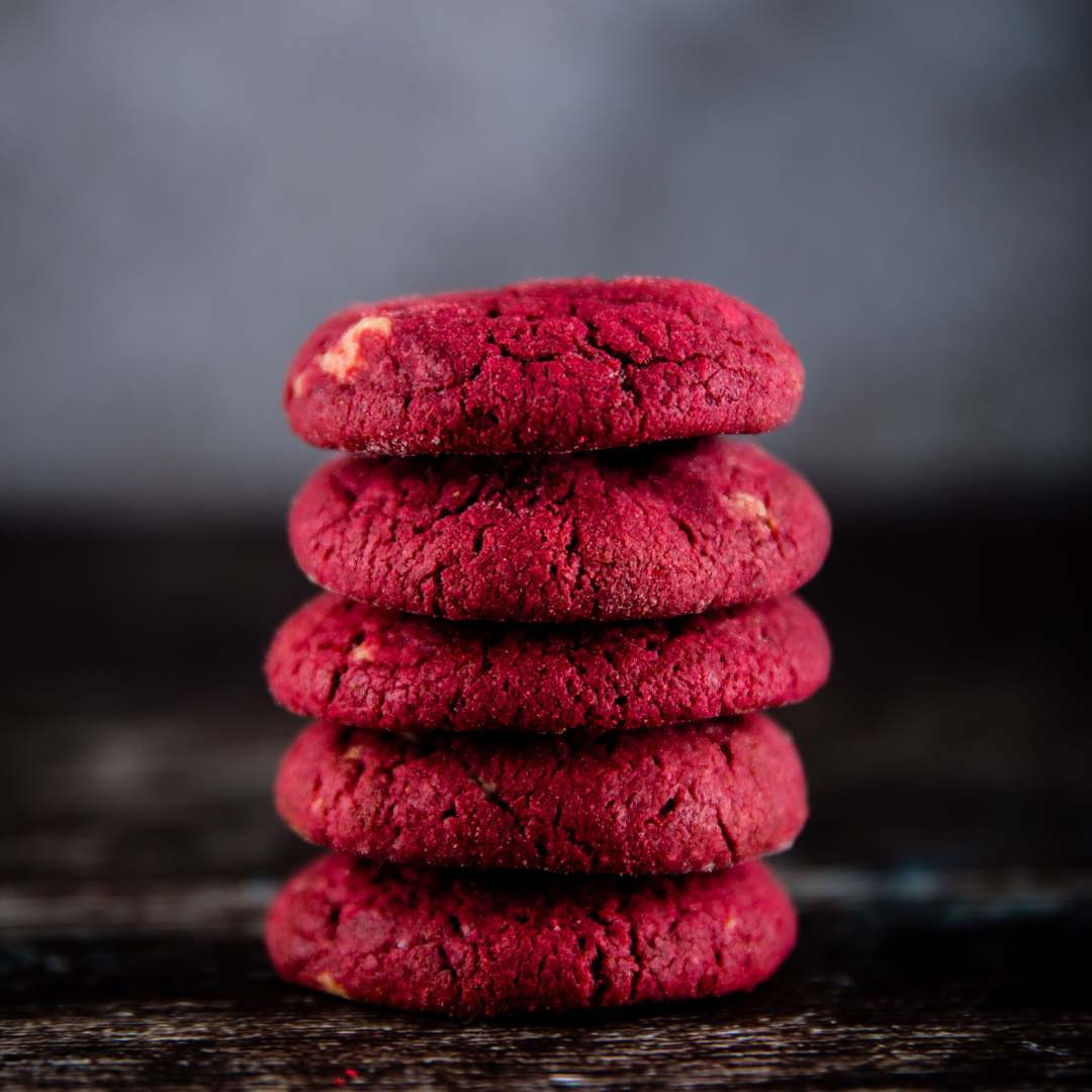 Red Velvet cookies with white chocolate chunks and stuffed with a cream cheese frosting.